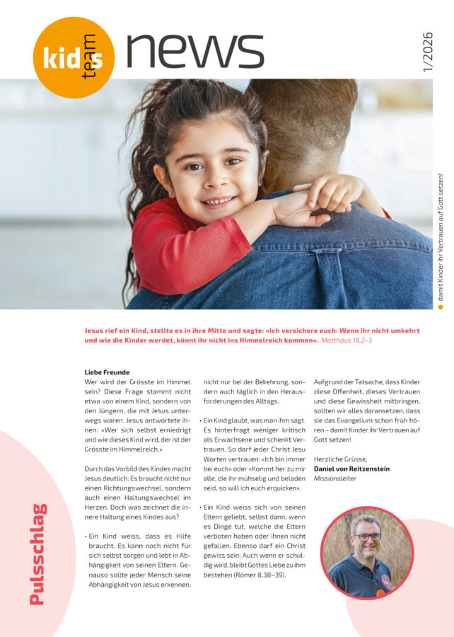 Du kannst die kids-team news entweder als gedrucktes Heft direkt zu dir nach Hause bestellen oder digital als Newsletter per E-Mail empfangen. Oder du schaust einfach regelmässig auf unserer Webseite nach Neuigkeiten.