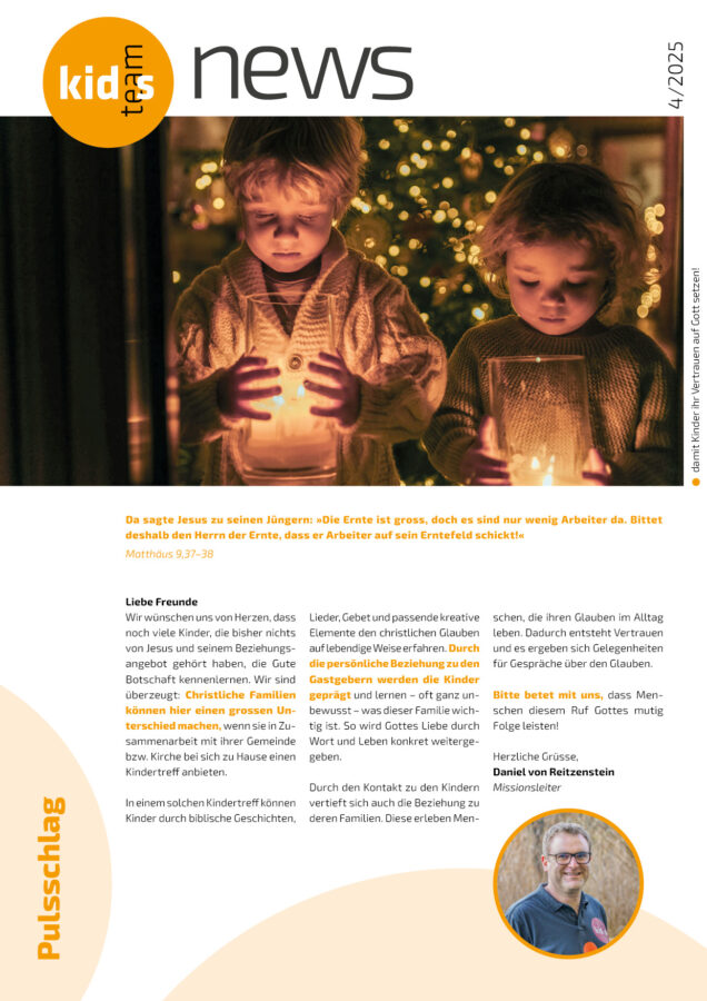 Du kannst die kids-team news entweder als gedrucktes Heft direkt zu dir nach Hause bestellen oder digital als Newsletter per E-Mail empfangen. Oder du schaust einfach regelmässig auf unserer Webseite nach Neuigkeiten.